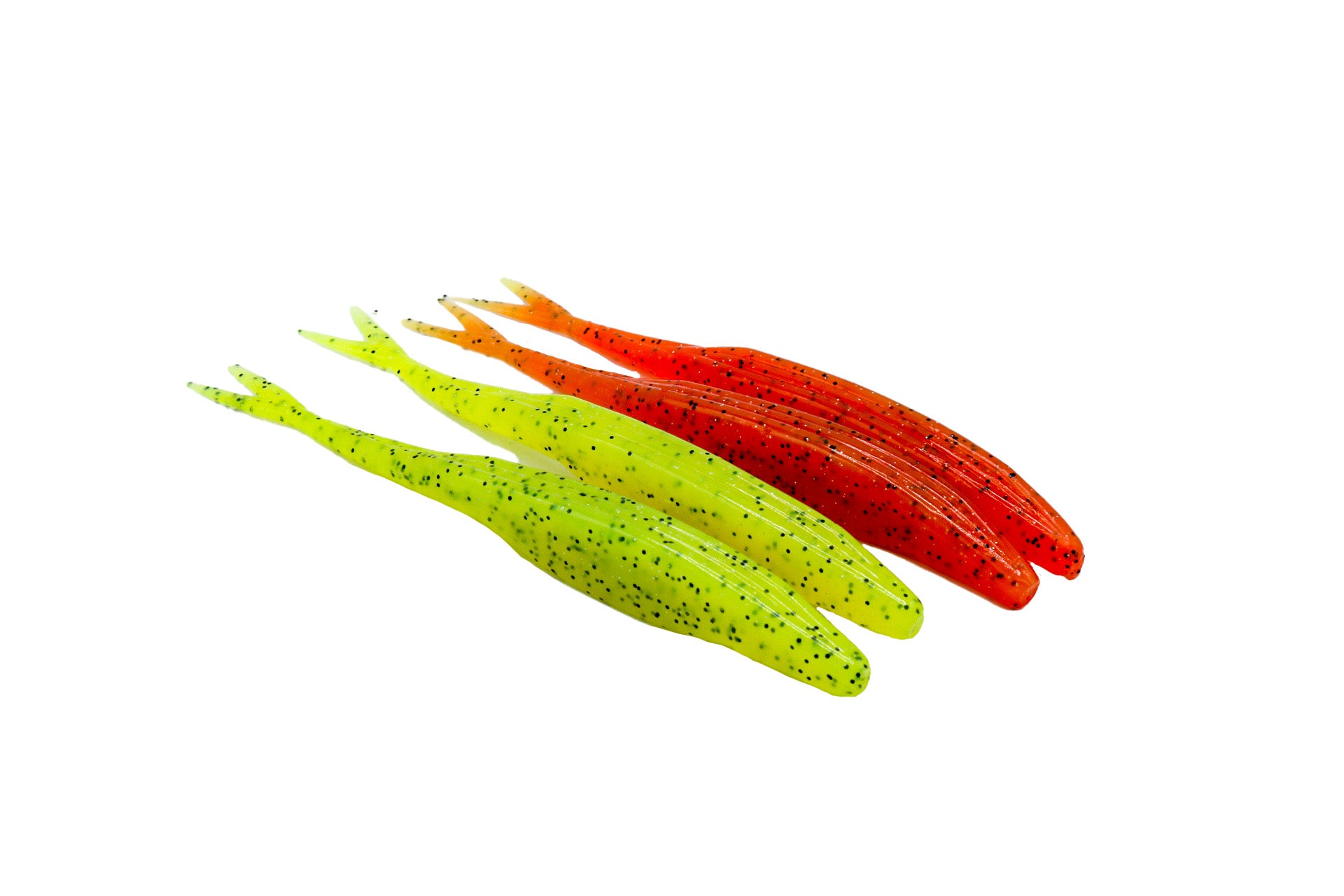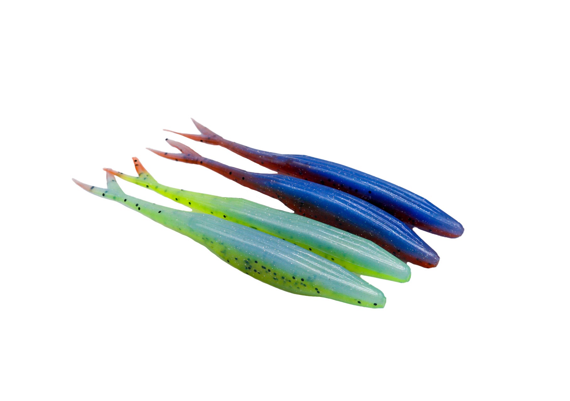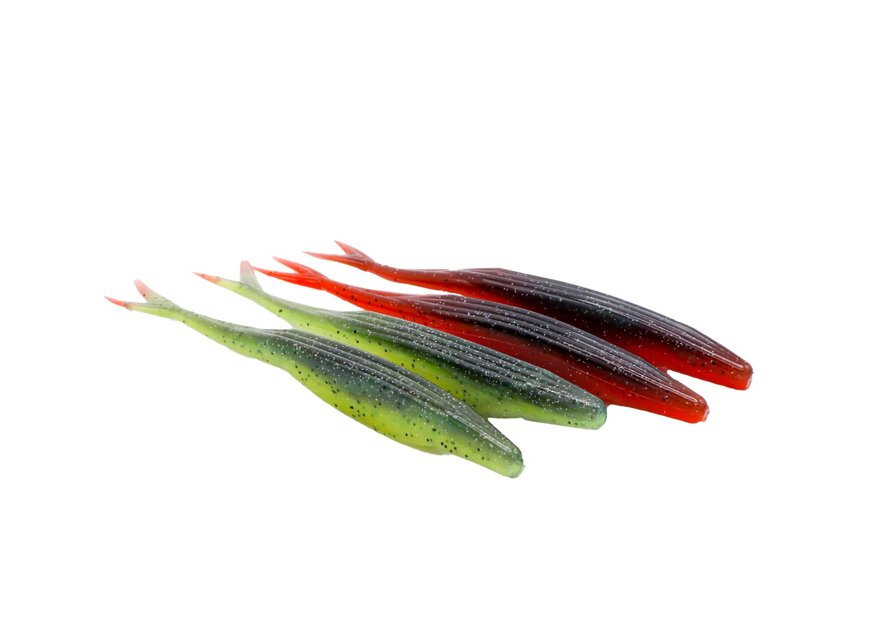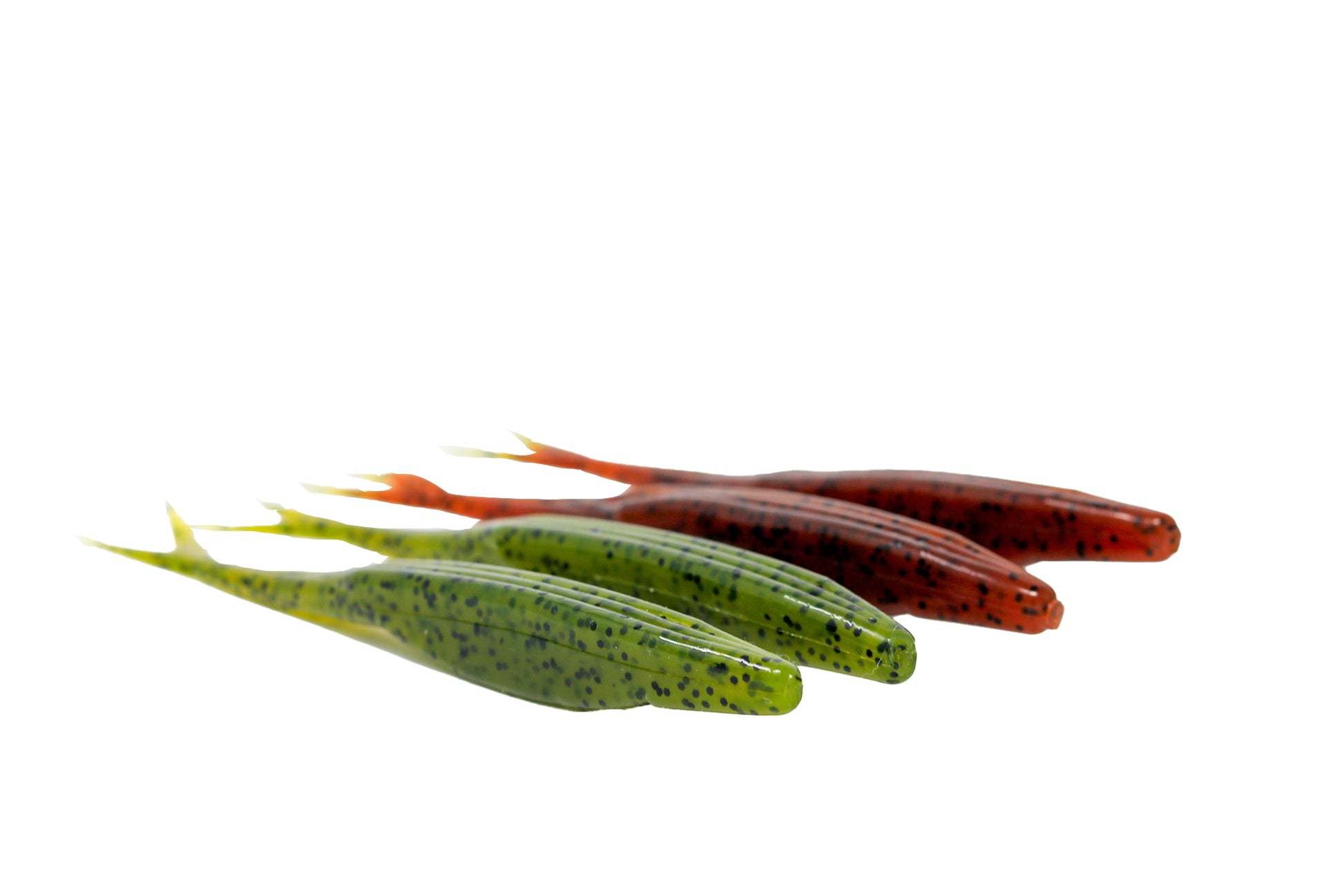 Some styles are laminated baits whereby one half changes from one color to another, and the other half also changes from one color to another such as Smoke to Black and Pearl to Blue. The other styles change from one color to another such as chartreuse to blood red.