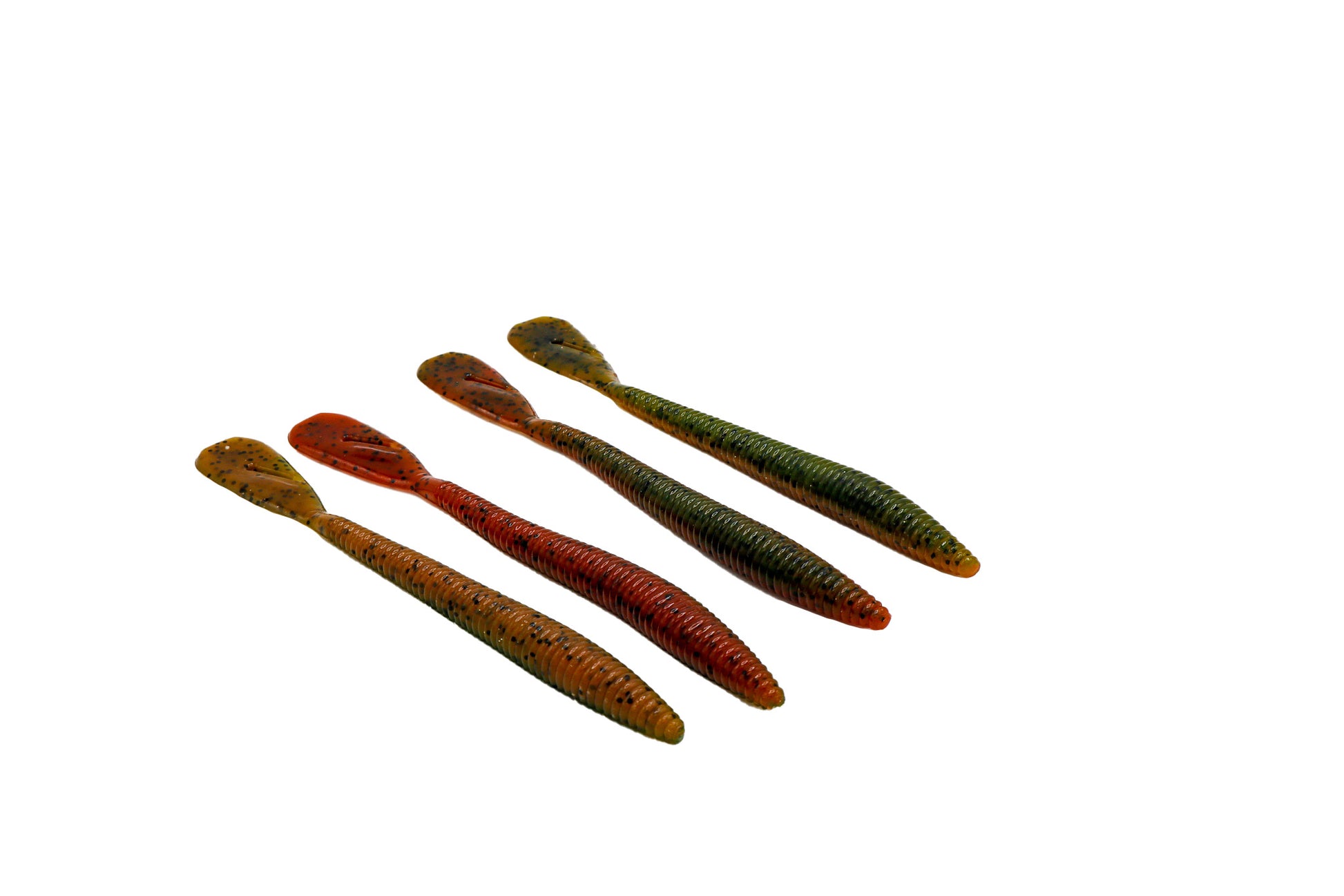 The Disco Worm is available in several color changing styles. Some styles are laminated baits whereby one half changes from one color to another, and the other half also changes from one color to another such as Smoke to Black and Pearl to Blue. The other style changes from one color to another such as Chartreuse to Red.